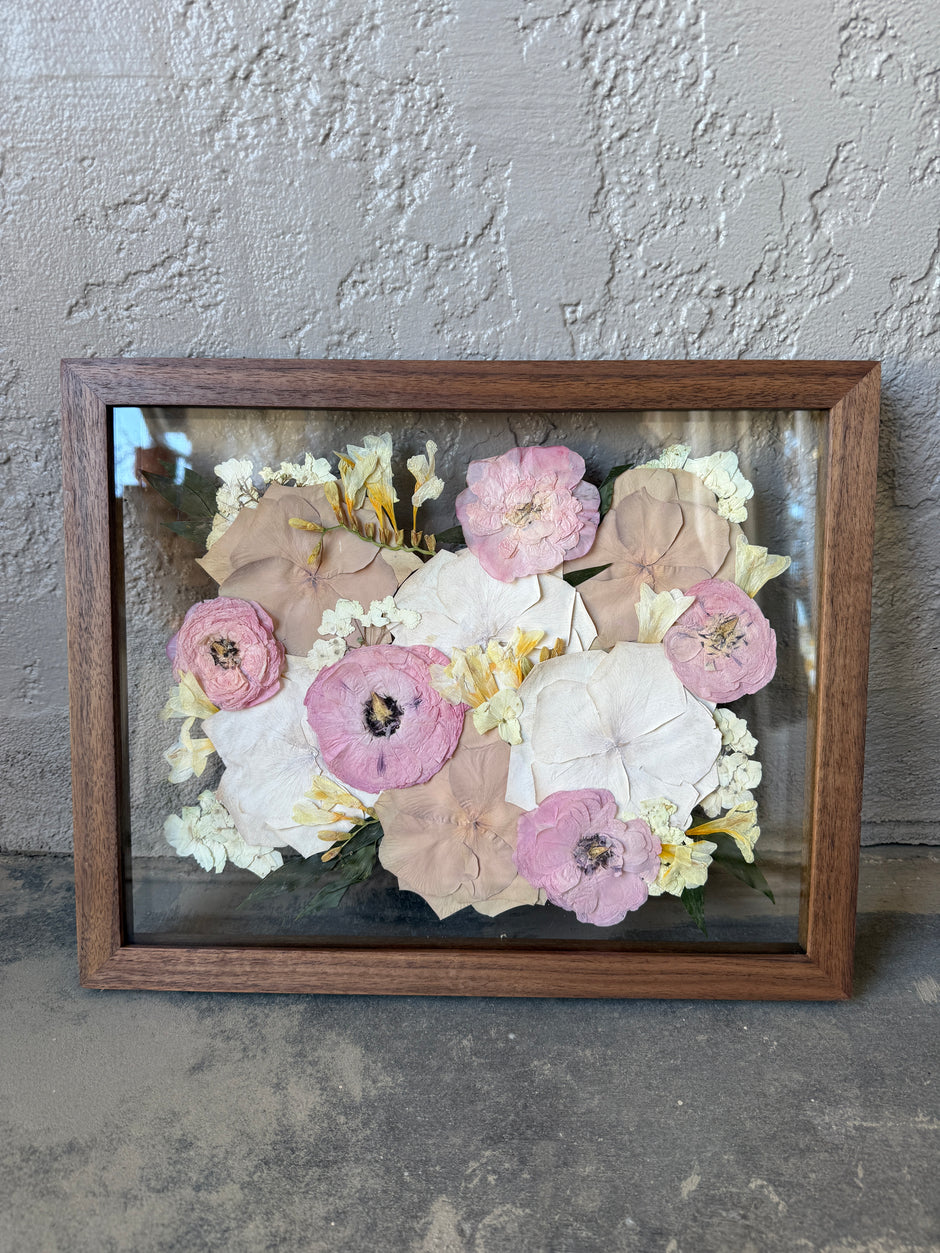 What happens if your wedding has passed, your blooms wilted, and you just now are finding out about flower preservation? We recreate your bouquet! Send over photos of your bouquet and we will order the exact flowers that were in it, press them, and frame them for you.